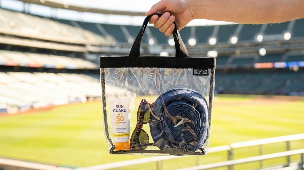 Nobody wants to carry their personal medical items or credit cards where the whole world can see them. Stadiums understand this, which is why they offer a small loophole. You are allowed to carry one tiny, non-transparent clutch purse for your private items. However, this clutch must strictly measure no larger than 4.5 inches by 6.5 inches. Because your overall space is incredibly limited, every single piece of sun protection gear you bring must earn its spot inside that transparent puzzle.