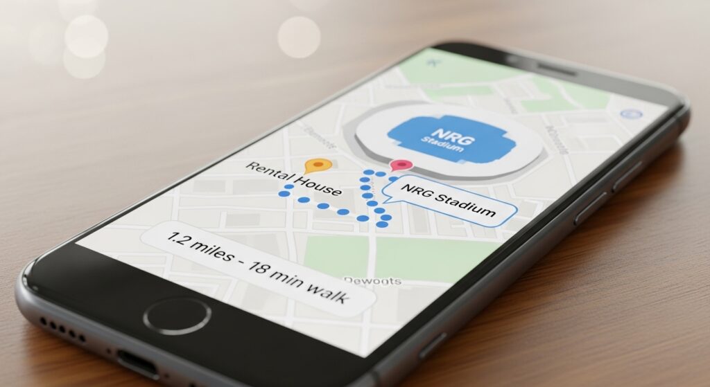 Before you ever enter your credit card information, you absolutely must verify the exact walking distances on Google Maps. Enter the actual address of the rental property and map a walking route directly to the NRG Stadium pedestrian gates.