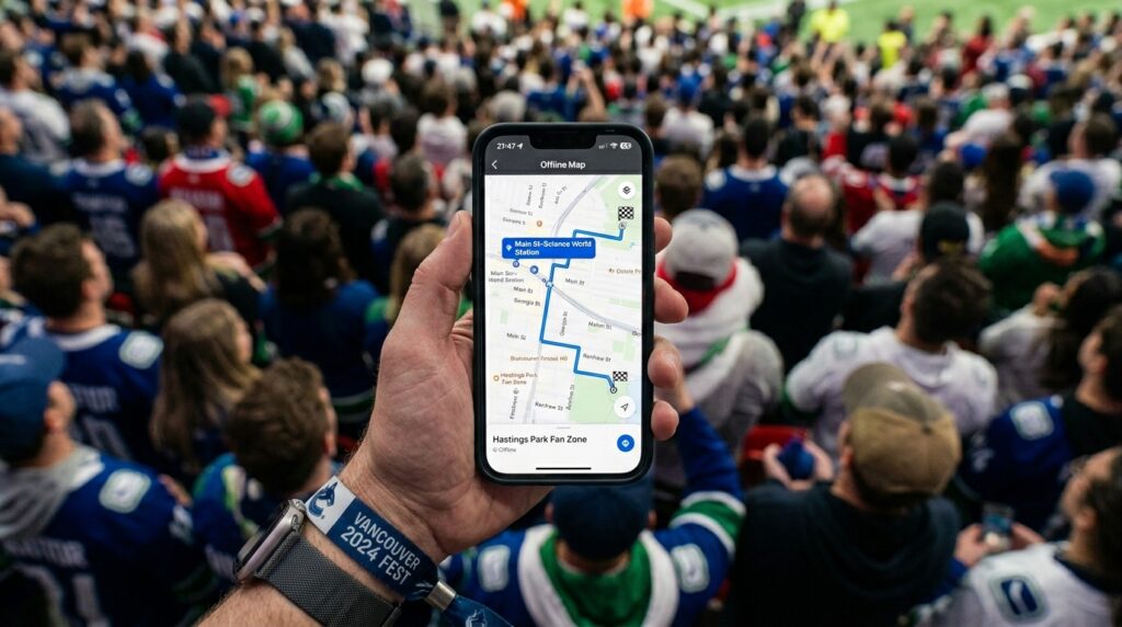 Even when the networks completely crash during the peak exiting crowds, your Stadium Route app will instantly display the intricate SkyTrain transfer routes. It will highlight the exact entrances to the Hastings Park festival grounds, seamlessly map out the waterfront Last Mile pedestrian path, and ensure you find the absolute safest walking route back to your hotel. It eliminates the panic of the digital blackout, bridging the gap between the stadium chaos and your safe arrival.